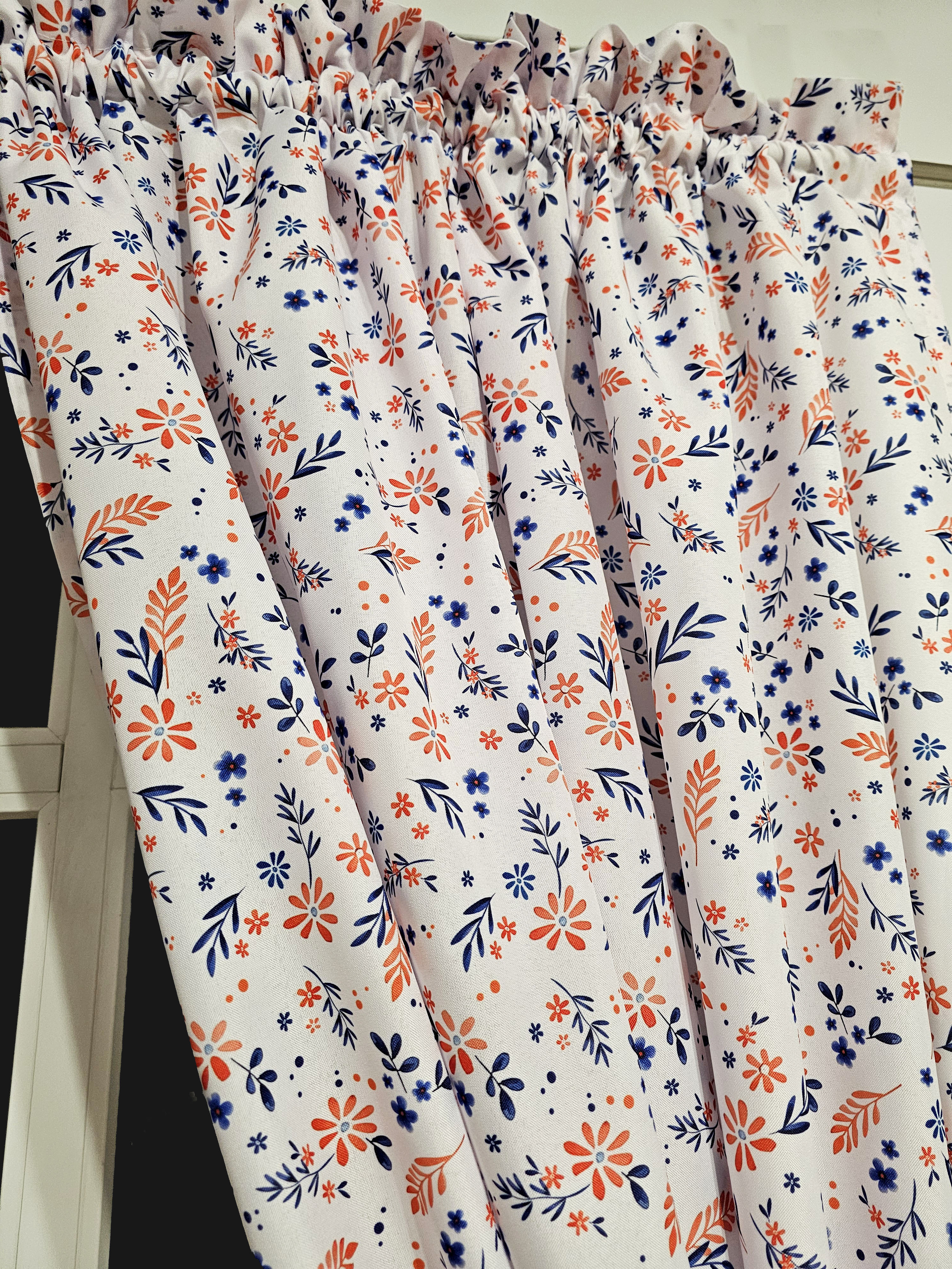 Rozmiar zasłony podajemy na płasko, czyli przed zmarszczeniem. Tkanina jest umarszczona w stosunku 1 : 2 co oznacza, że szerokość 140 cm po zmarszczeniu będzie wynosiła