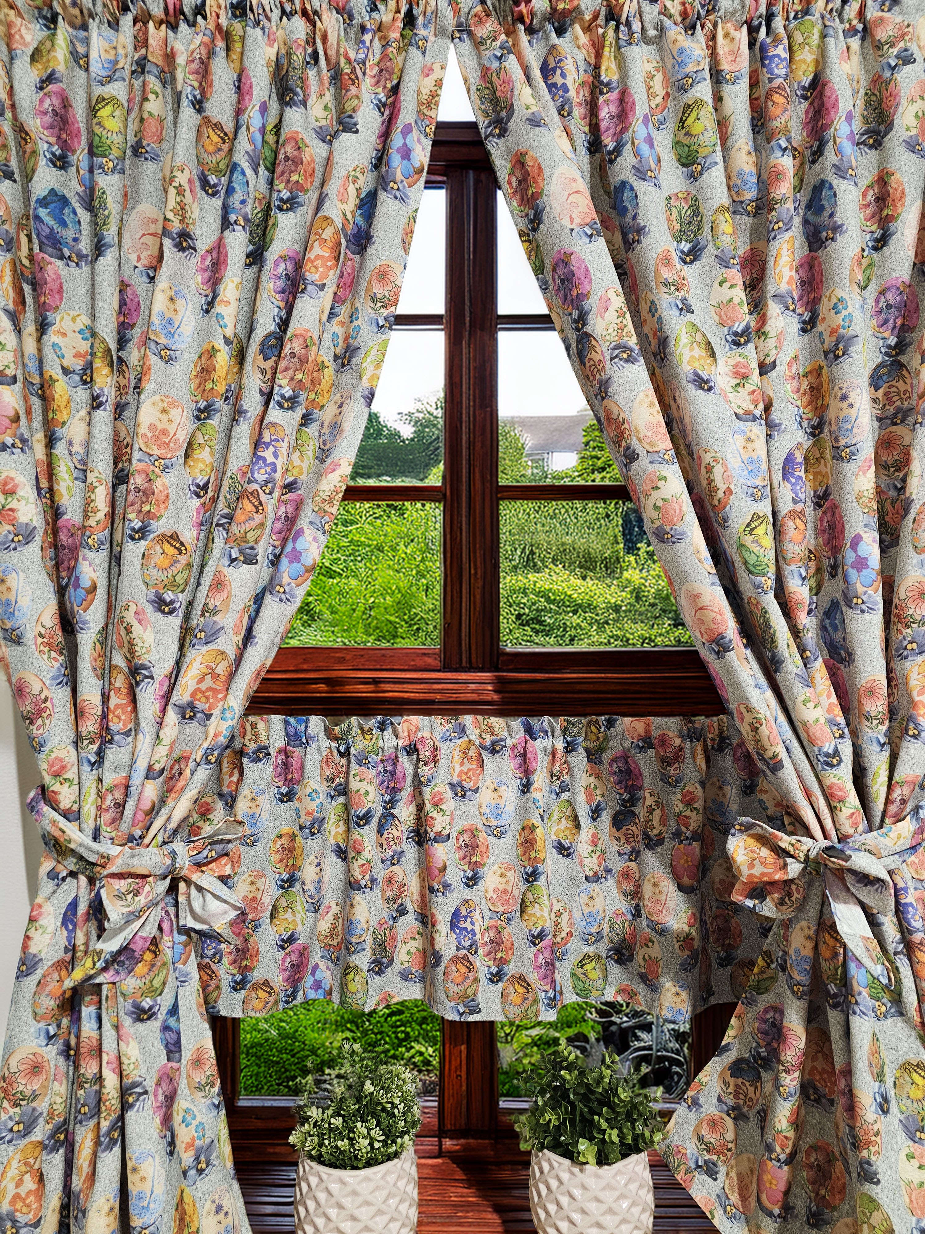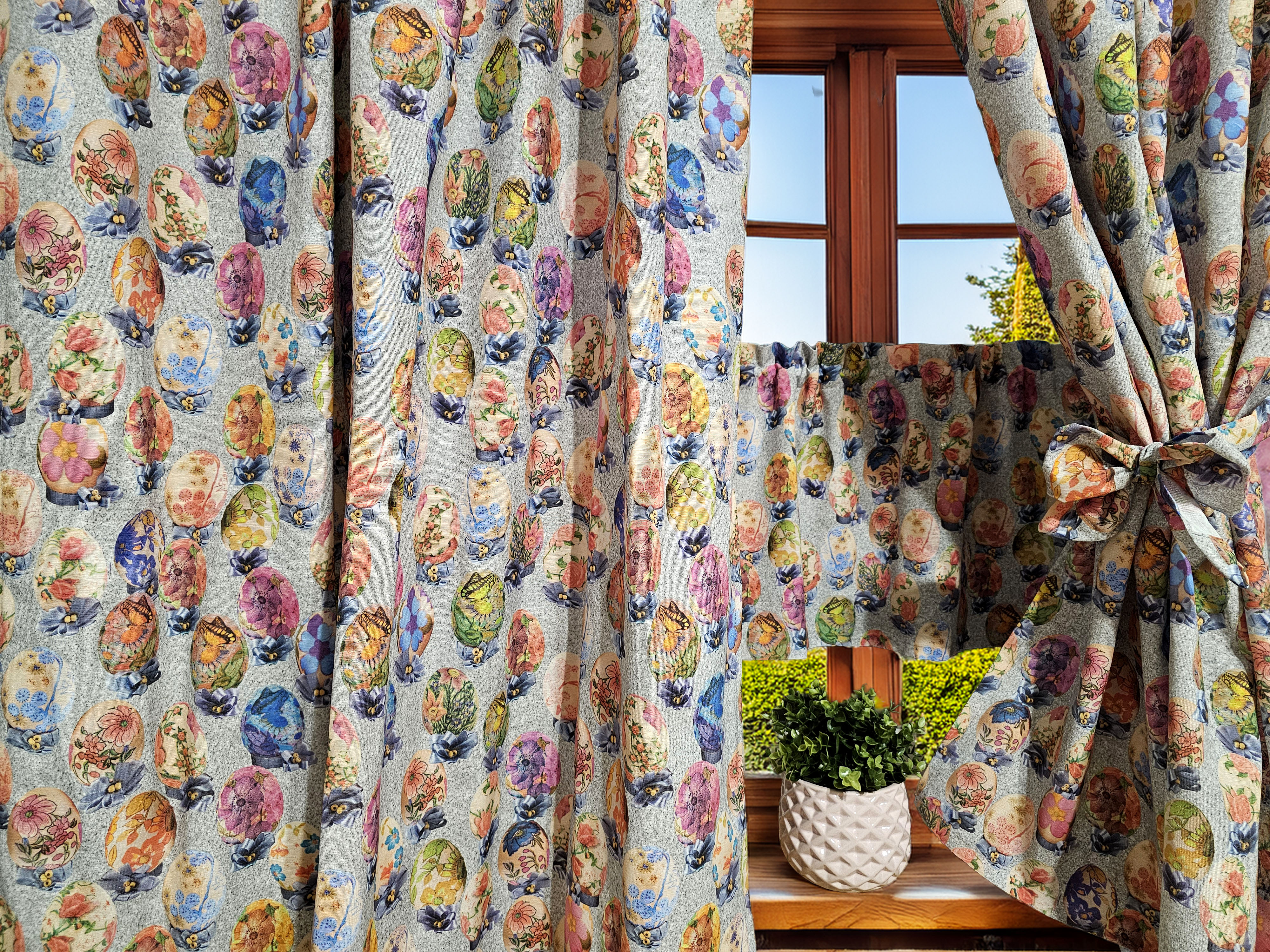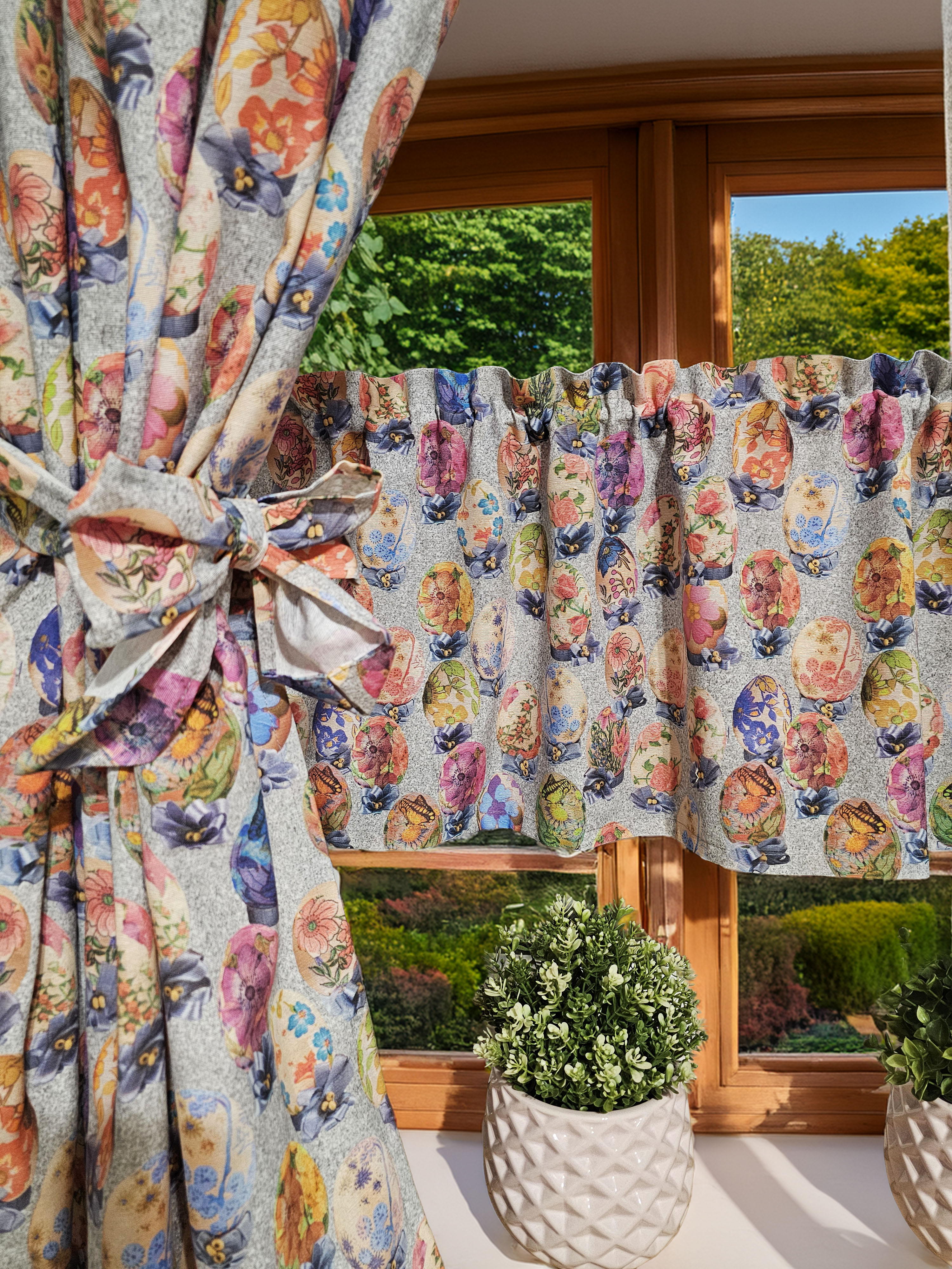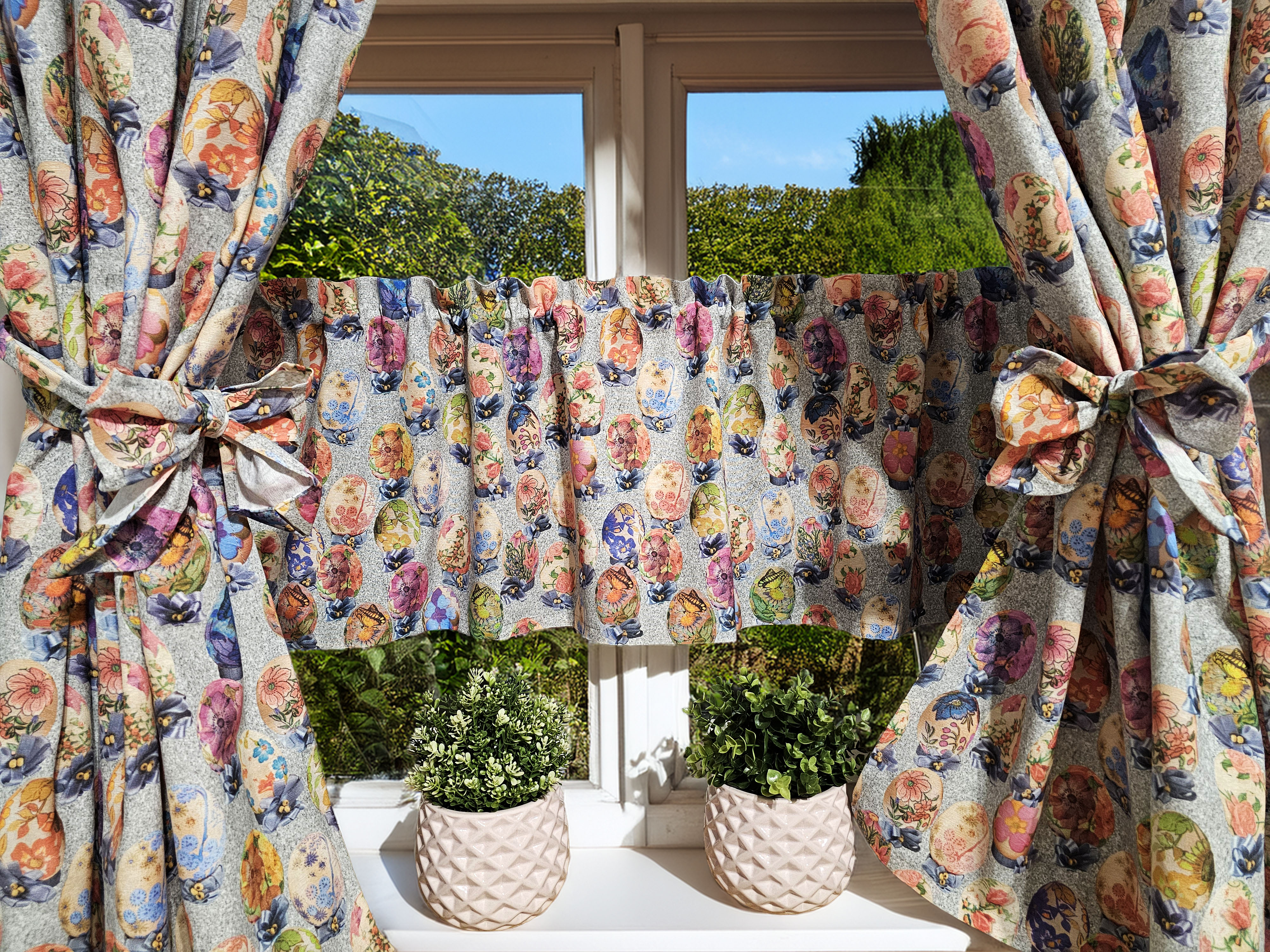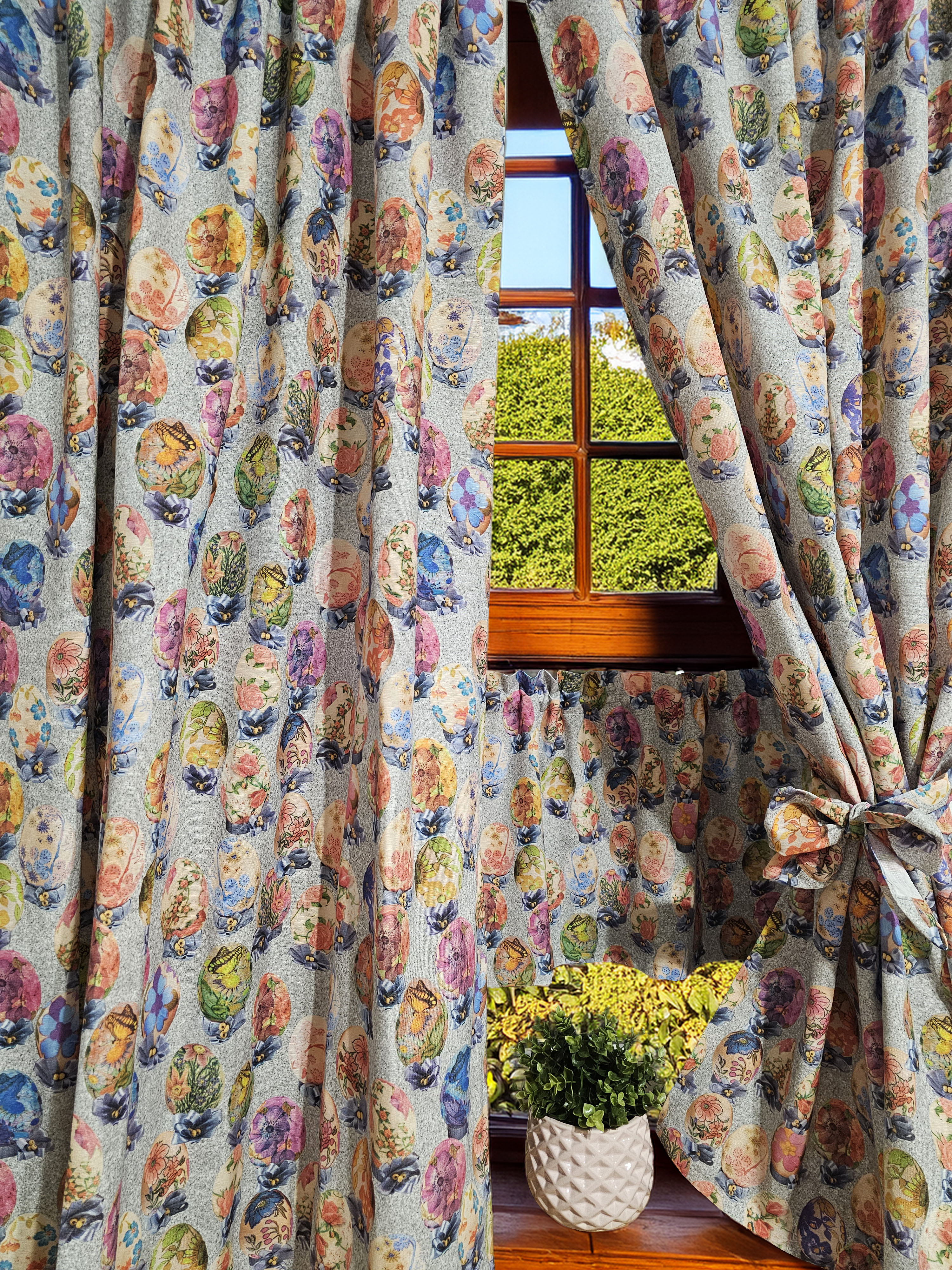 W cenie dwie sztuki zasłonek plus zazdrostka/lambrekin. Jest możliwość zakupienia do kompletu obrusów, poszewek.