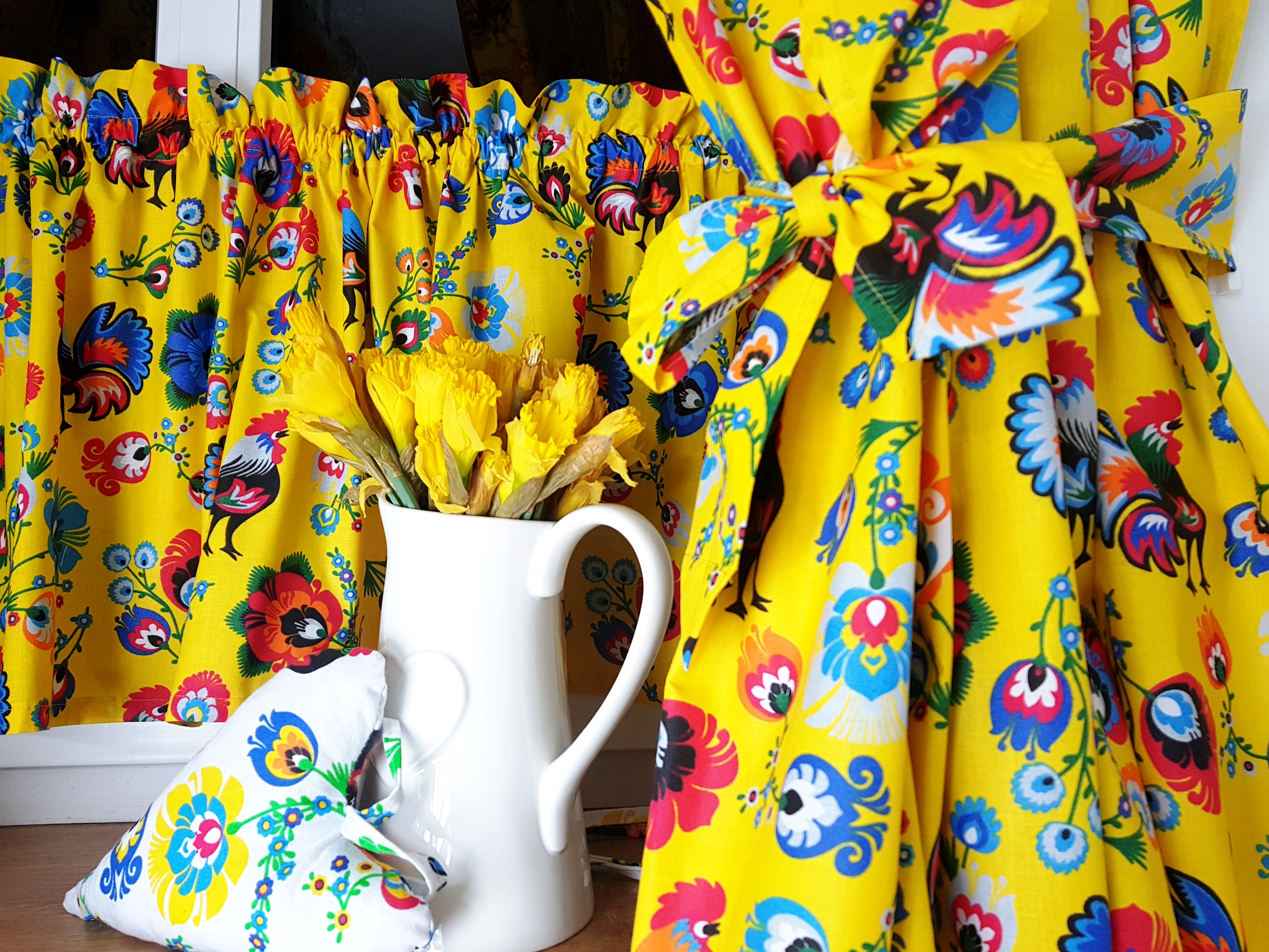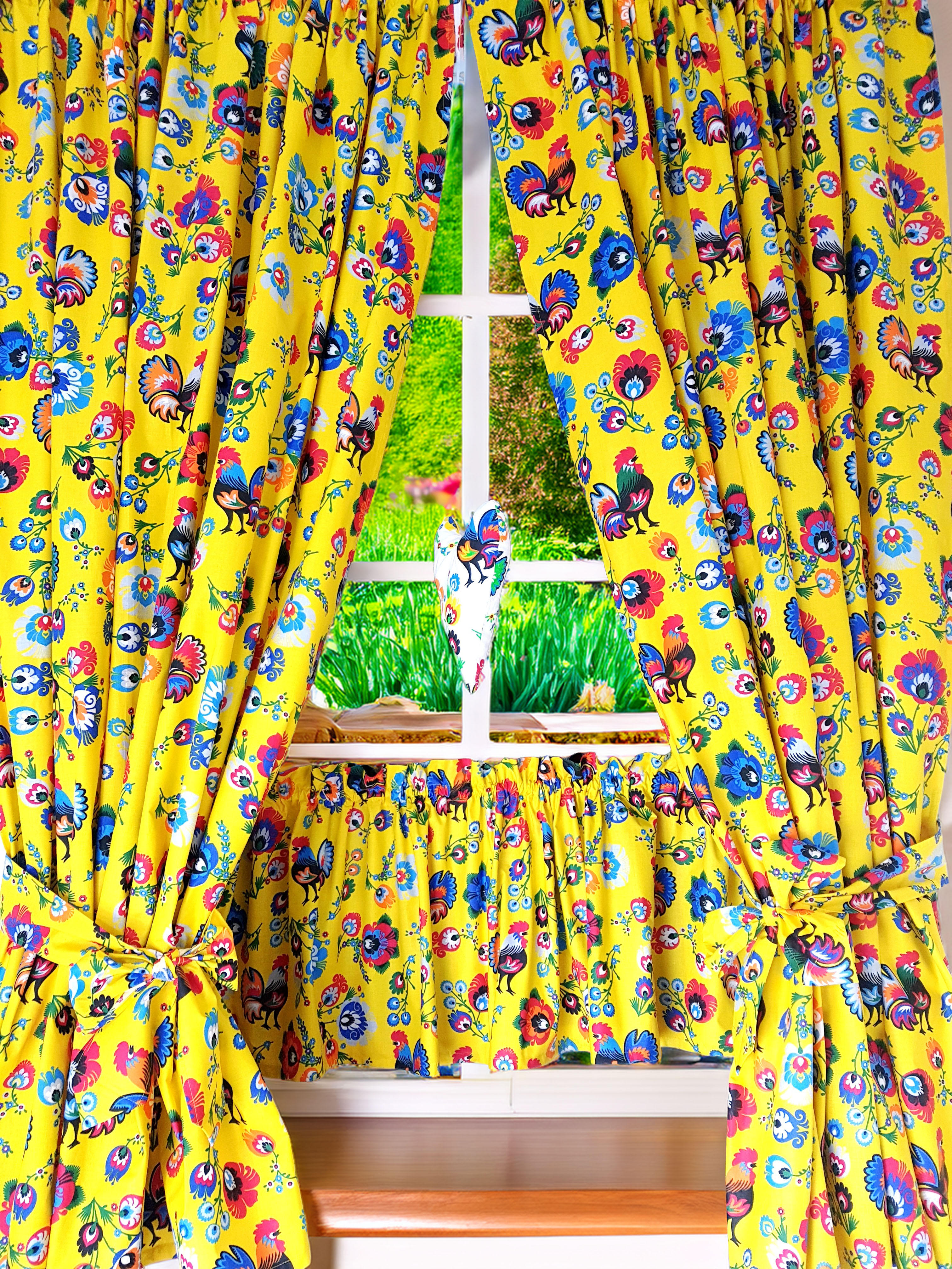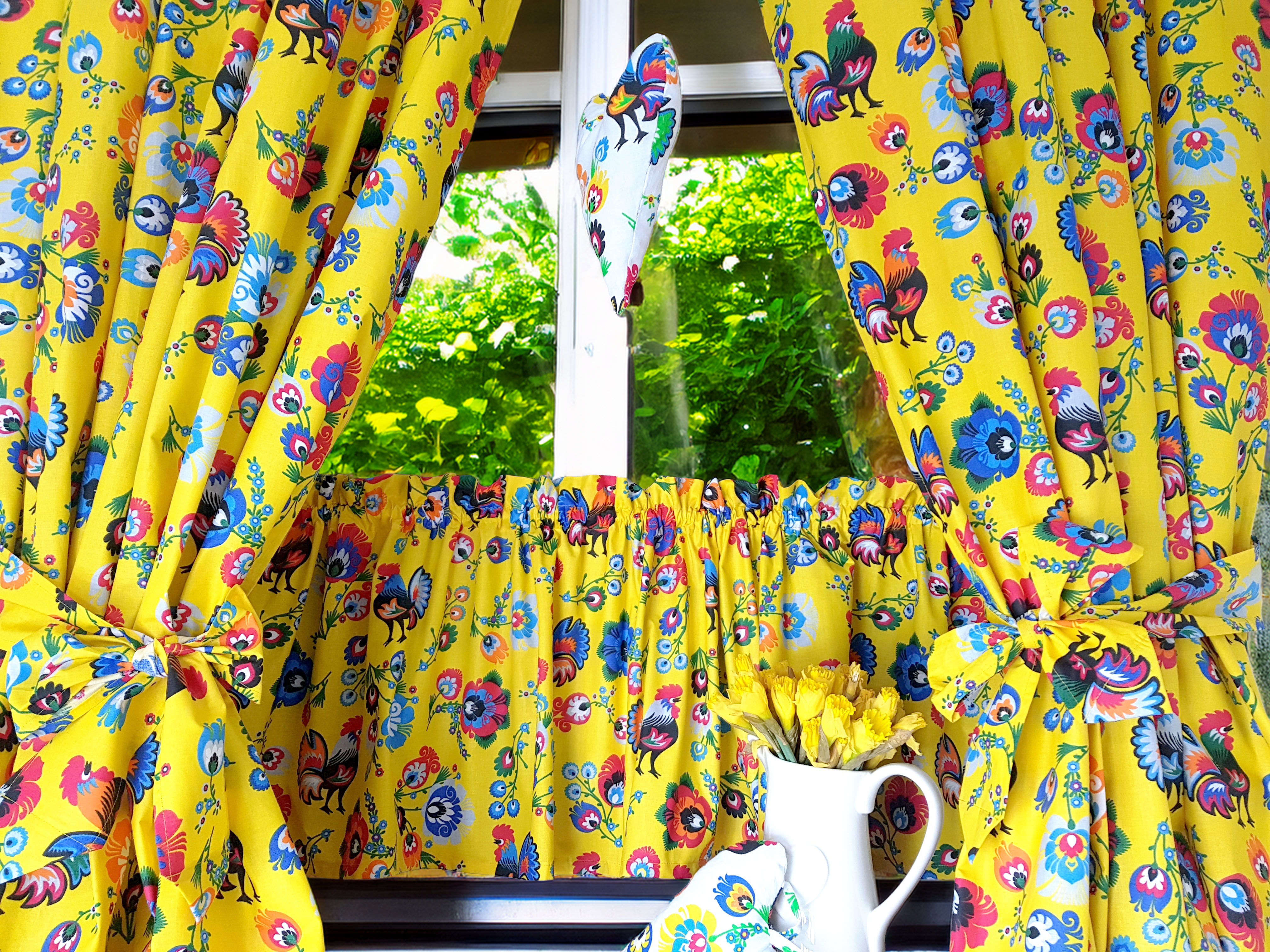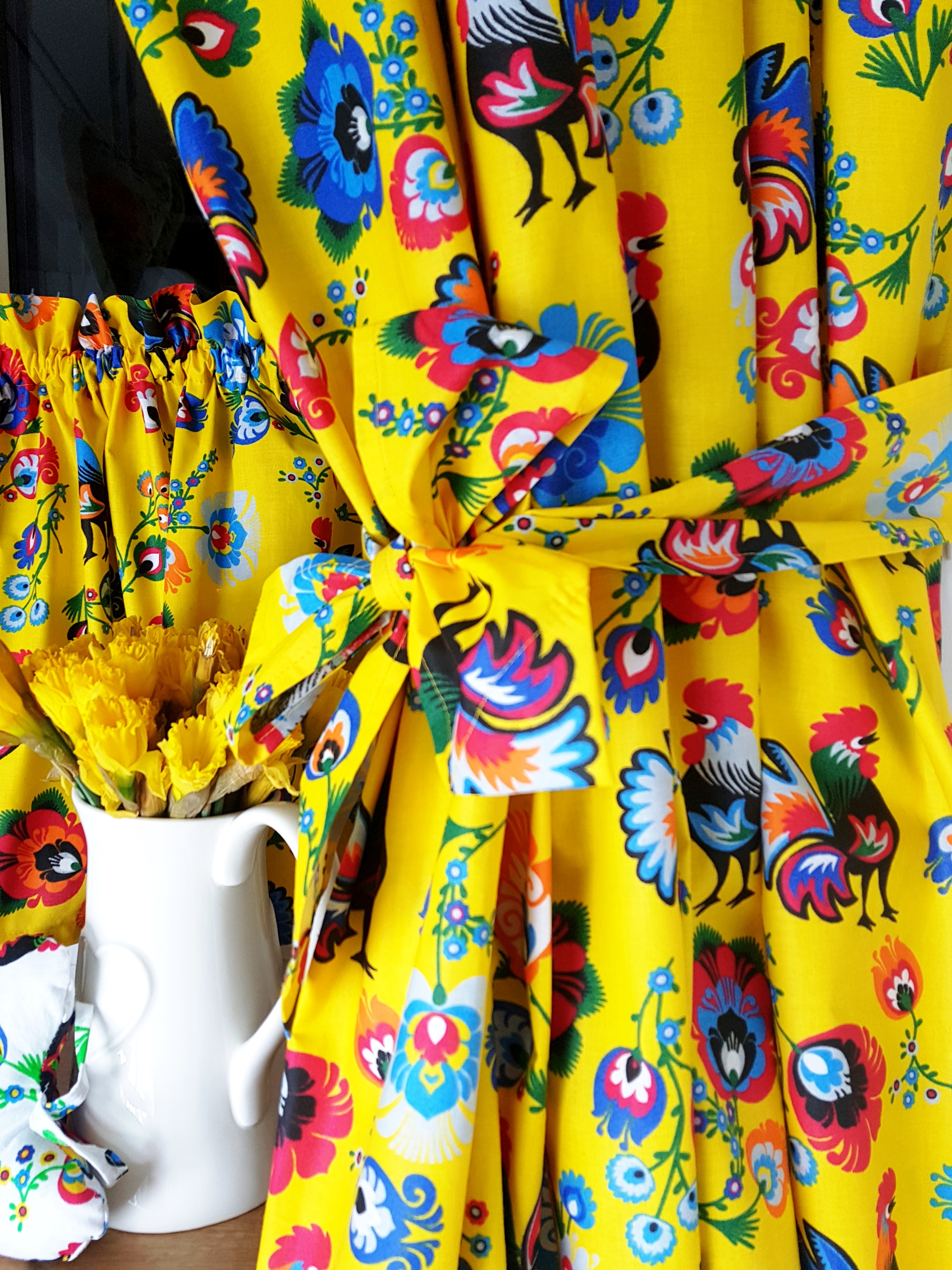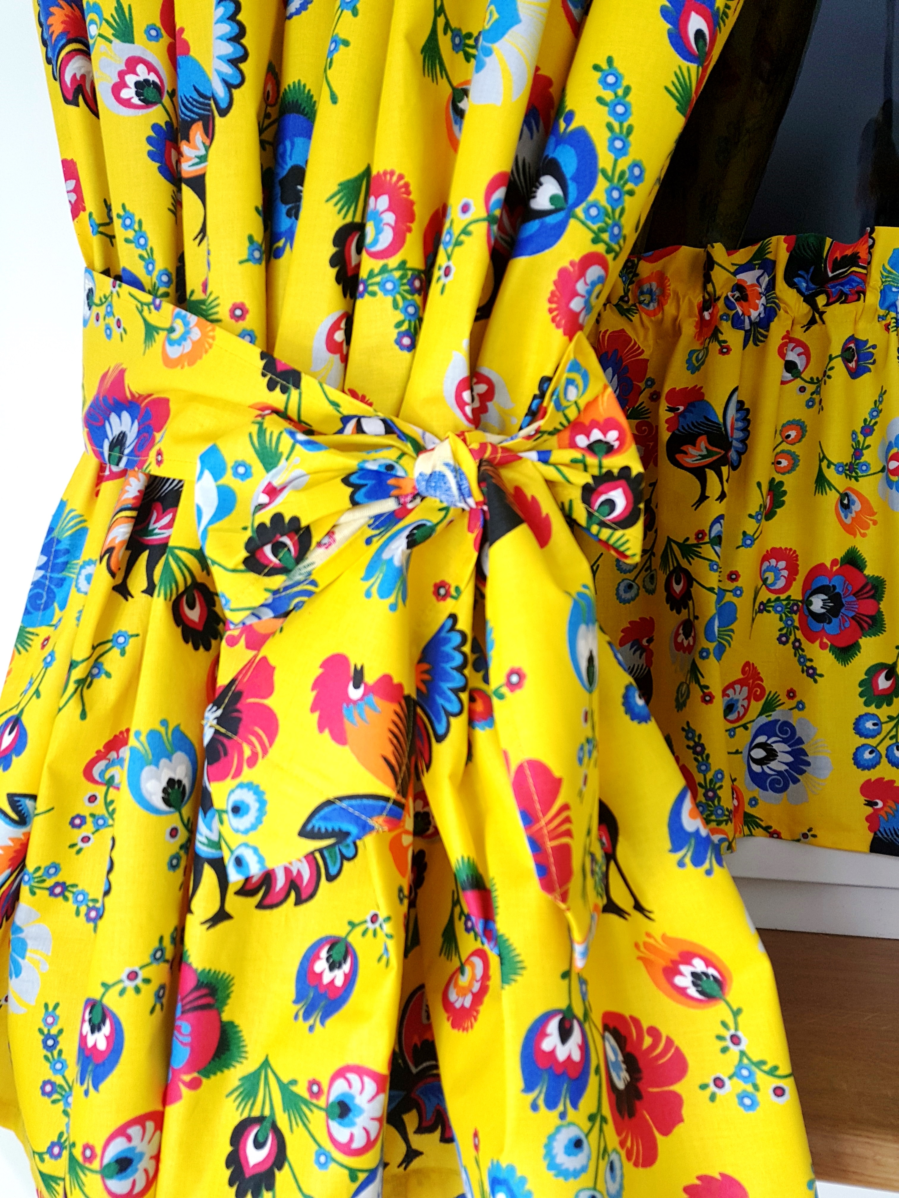 Komplet to dwie zasłonki na boki z wiązaniami oraz zazdrostka.
