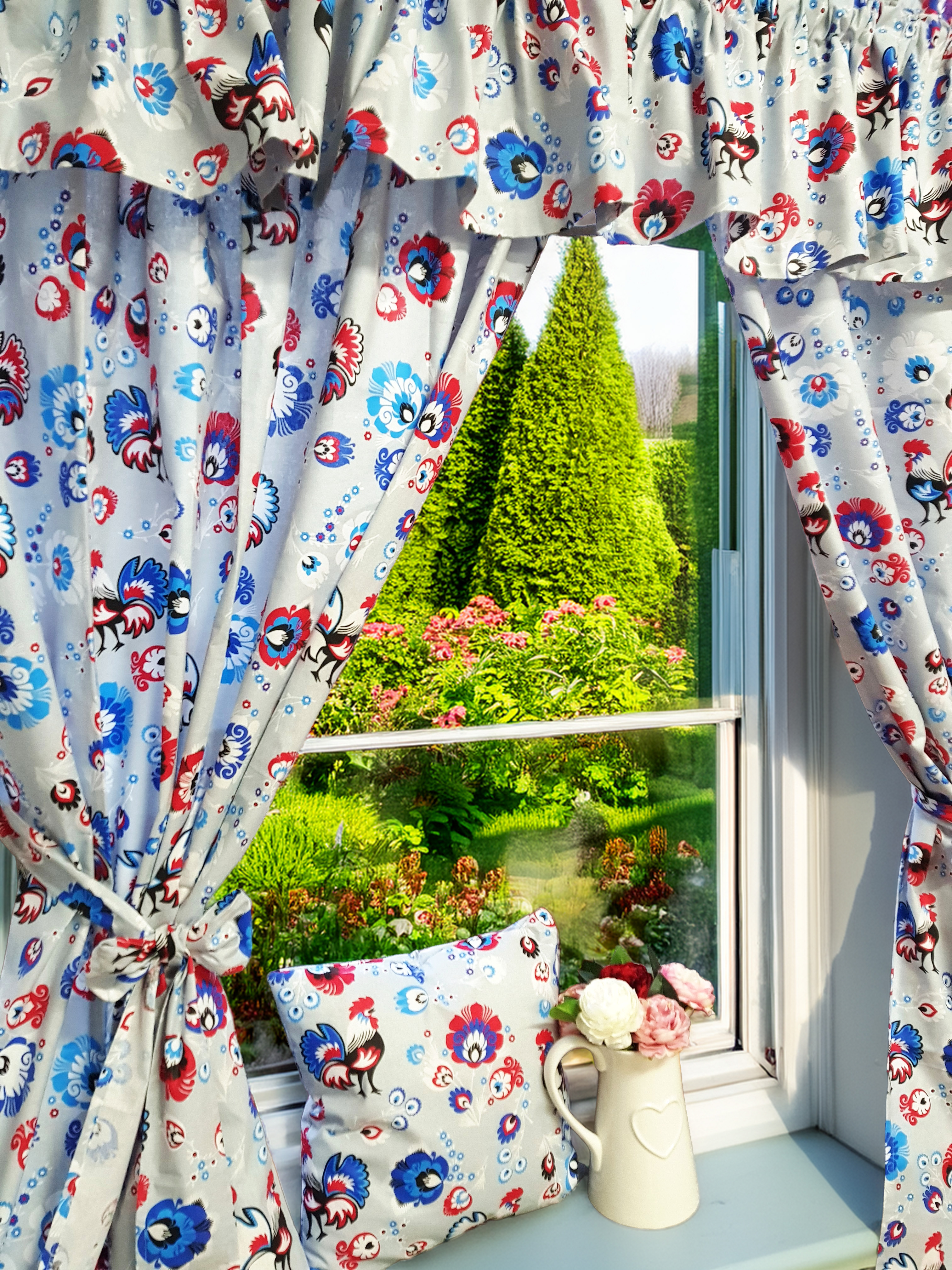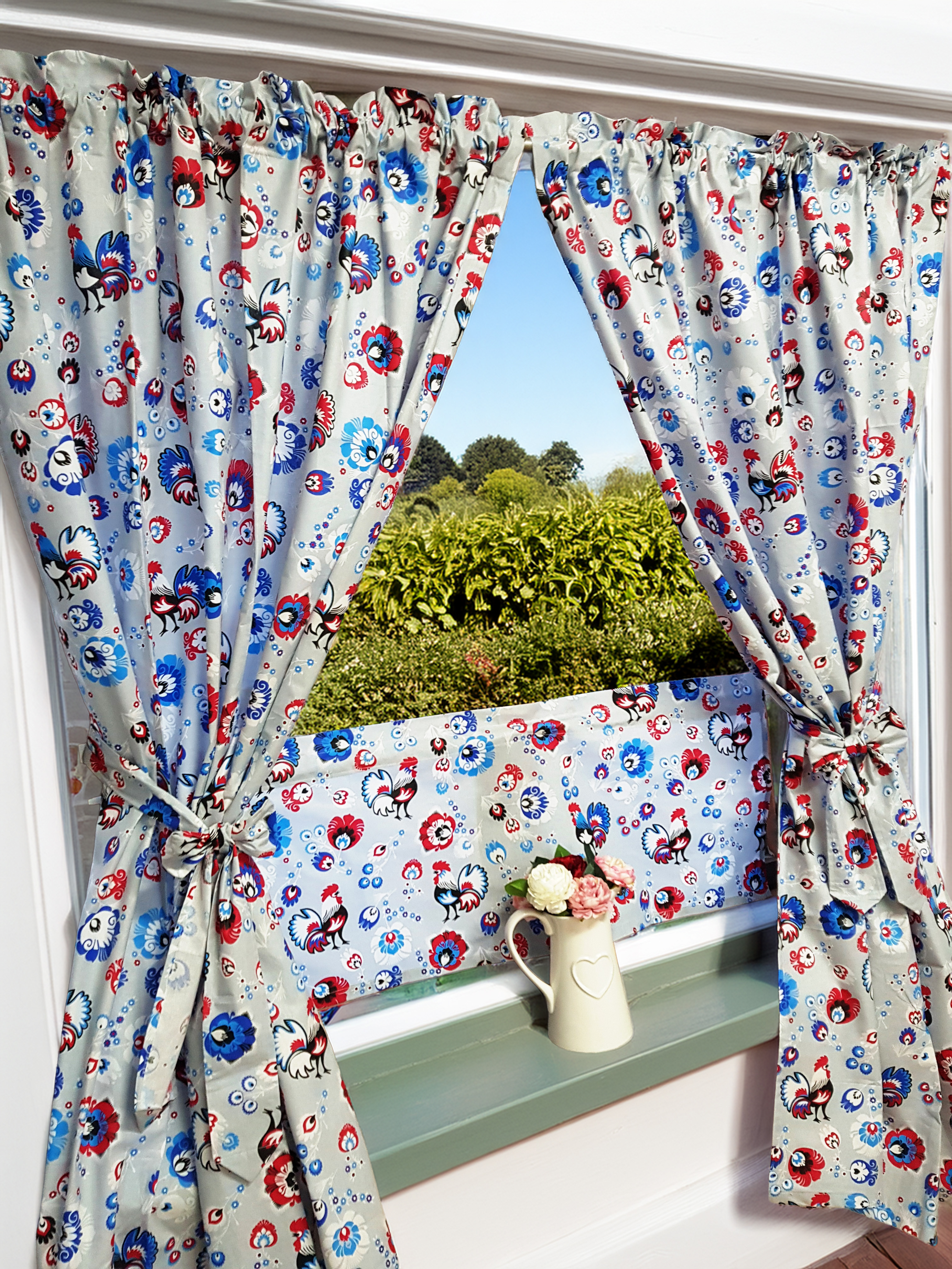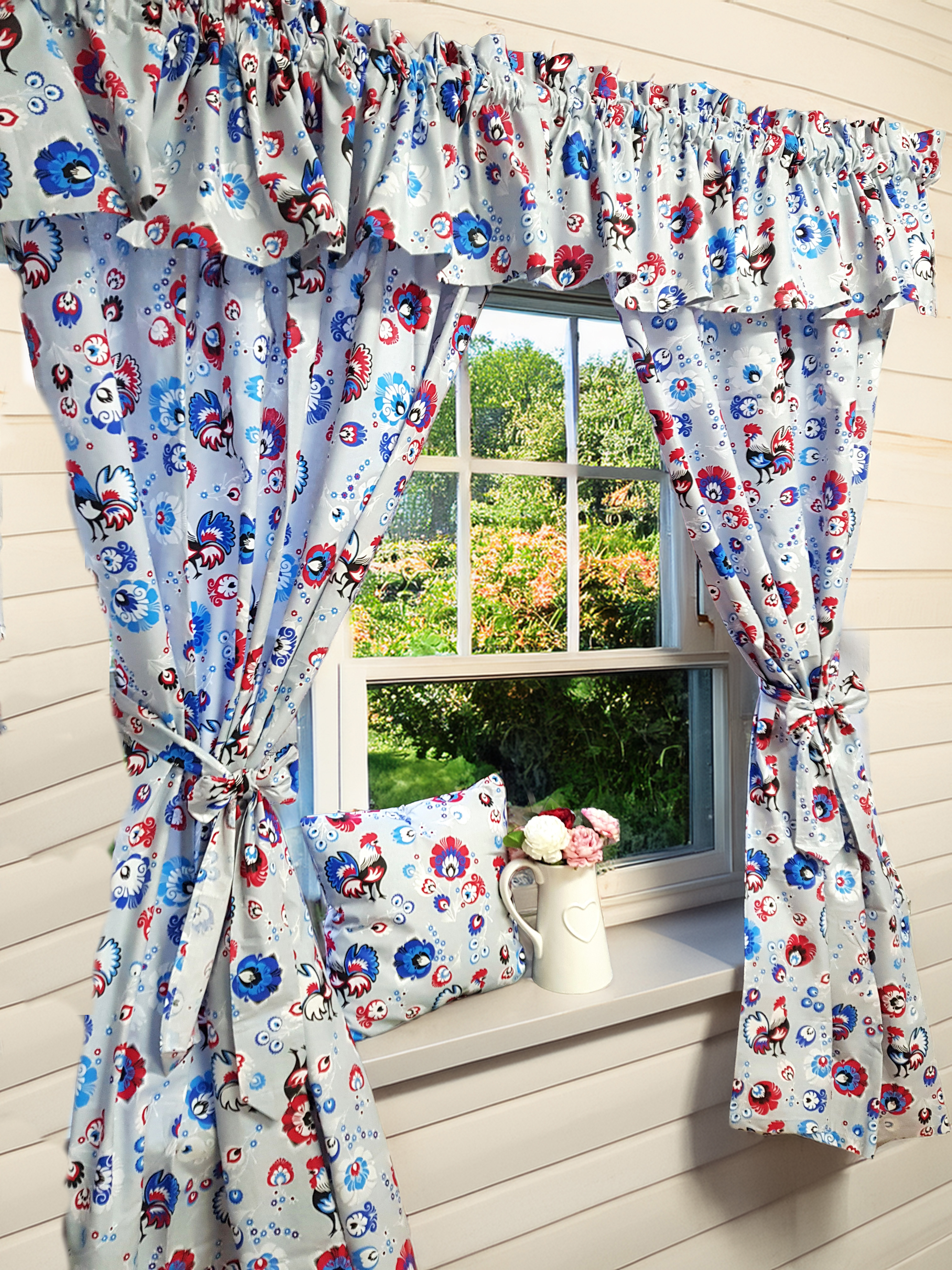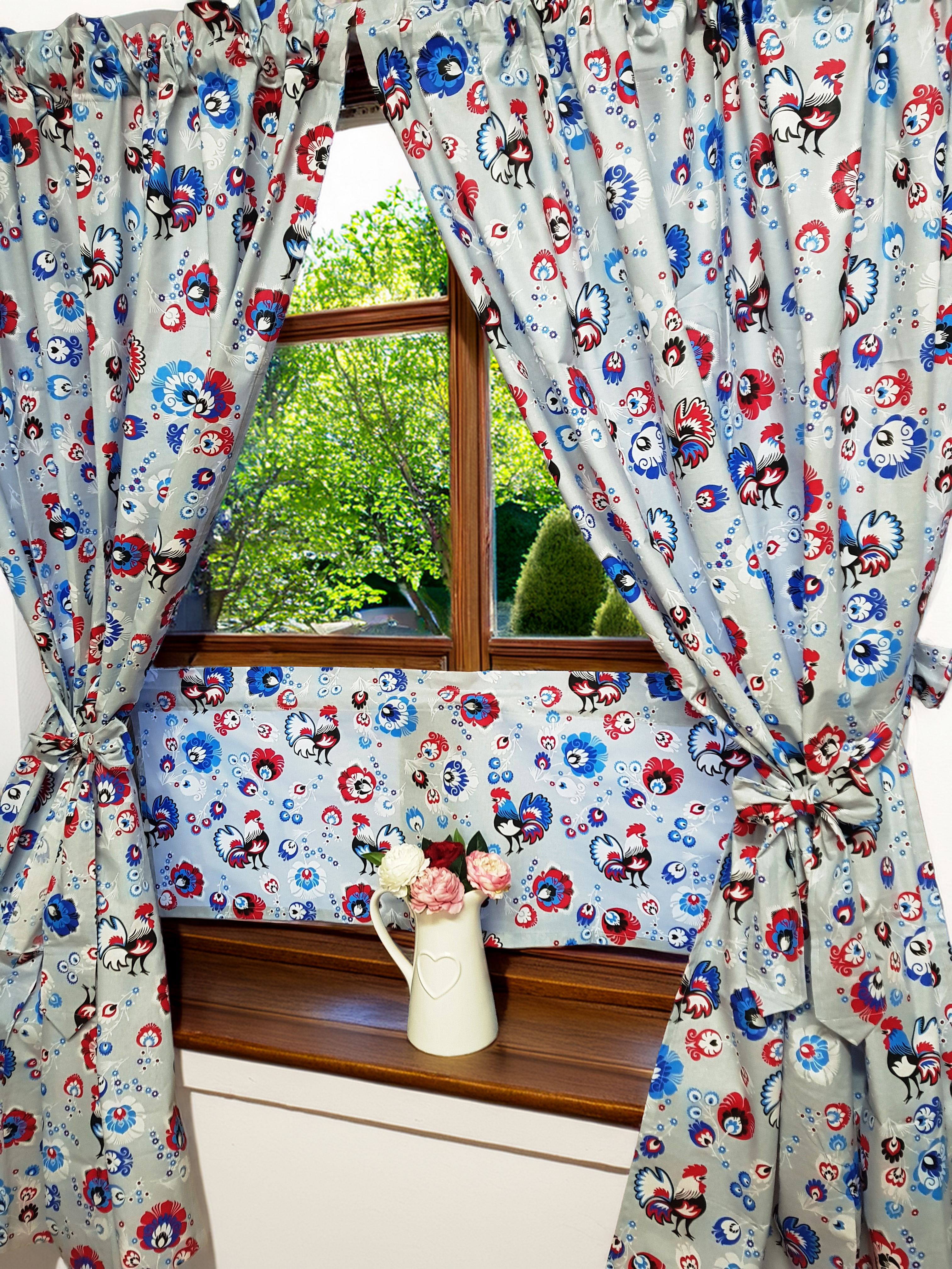 Komplet to dwie zasłonki na boki z wiązaniami oraz zazdrostka.