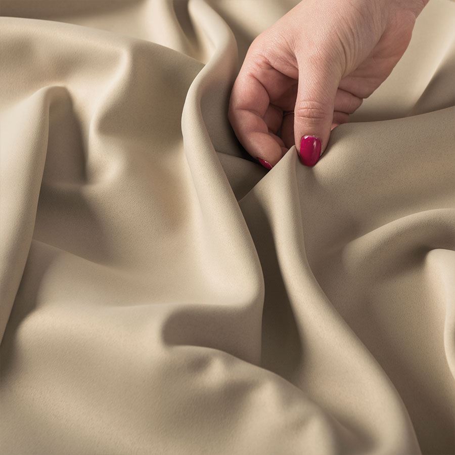 Zasłona z miękkiej tkaniny zaciemniającej. Tkanina jest dość ciężka przez co bardzo fajnie się układa, jej dodatkową zaletą jest to że prawie sie nie gniecie. Bardzo przyjemna w dotyku więc nadaje się też na poszewki i inne dekoracje.