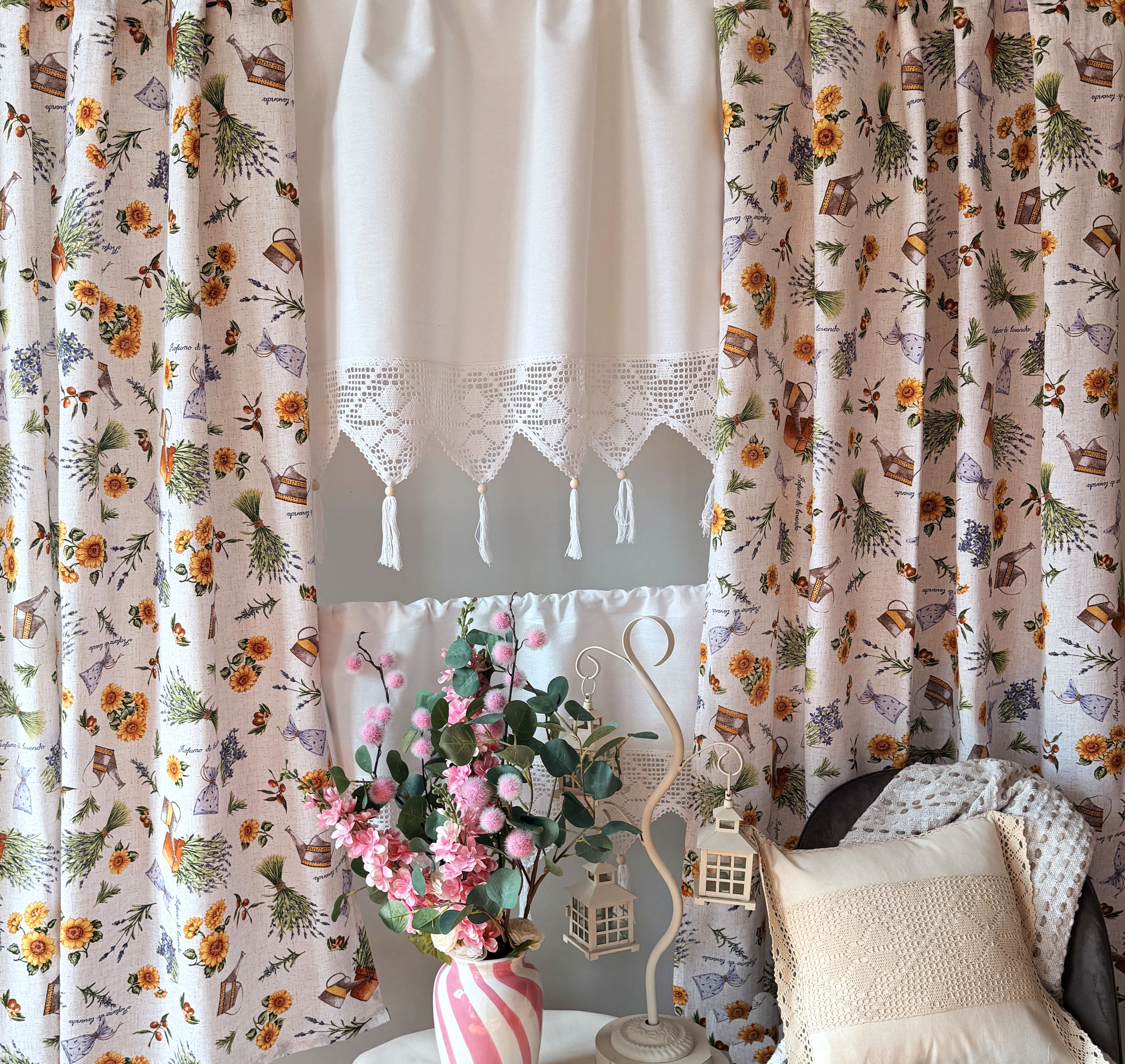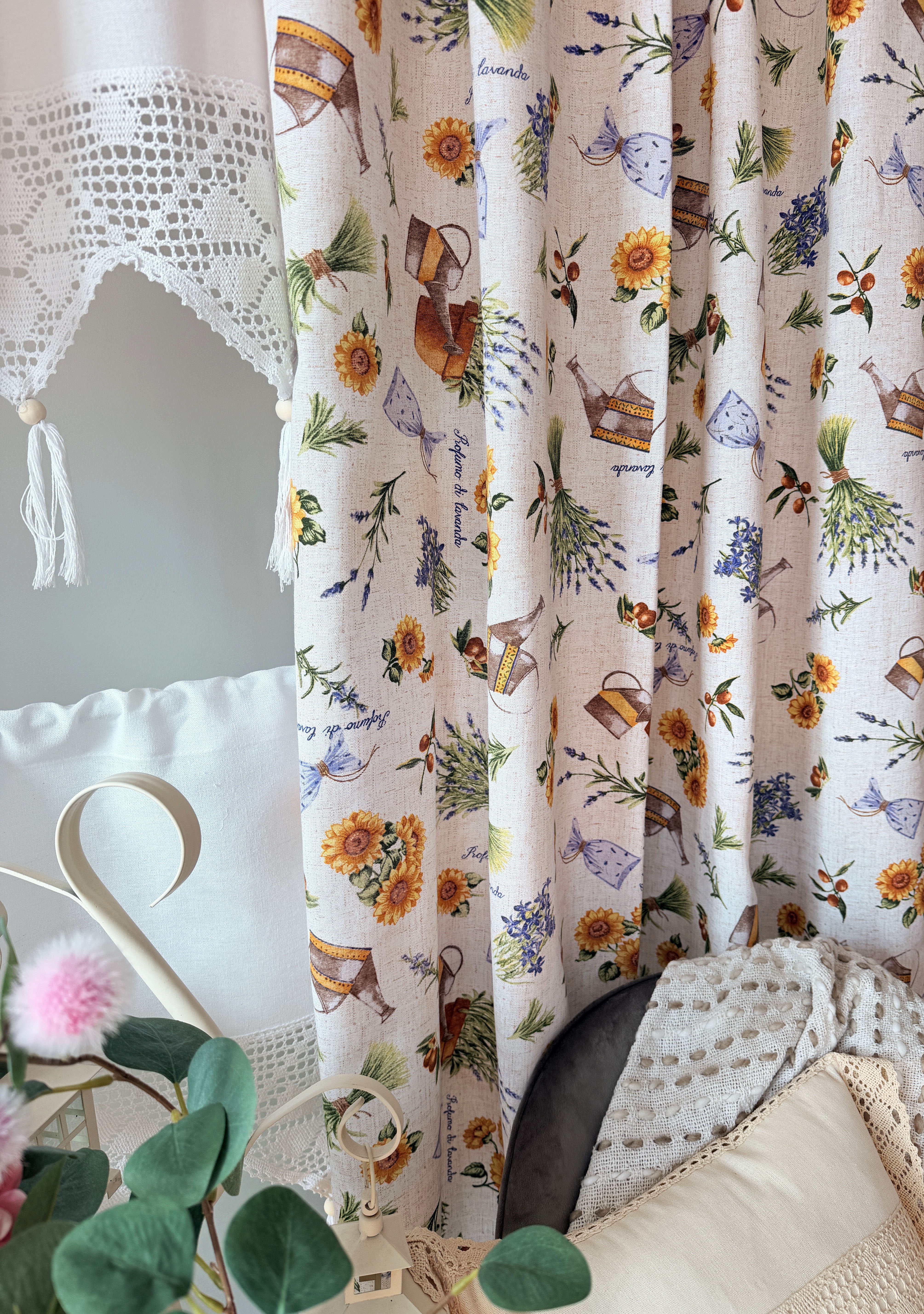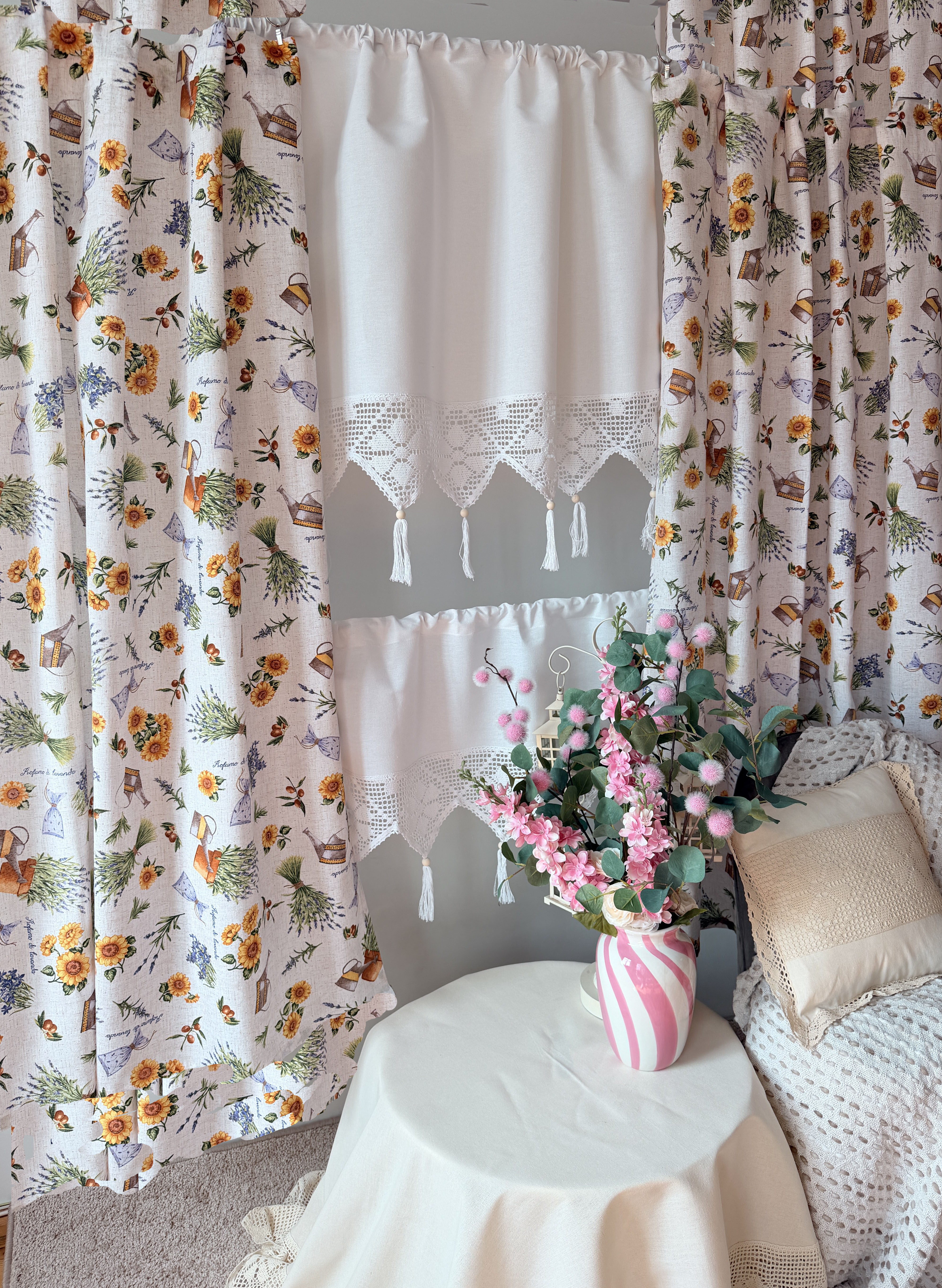 W cenie dwie sztuki zasłonek plus zazdrostka. Jest możliwość zakupienia do kompletu obrusów, poszewek.