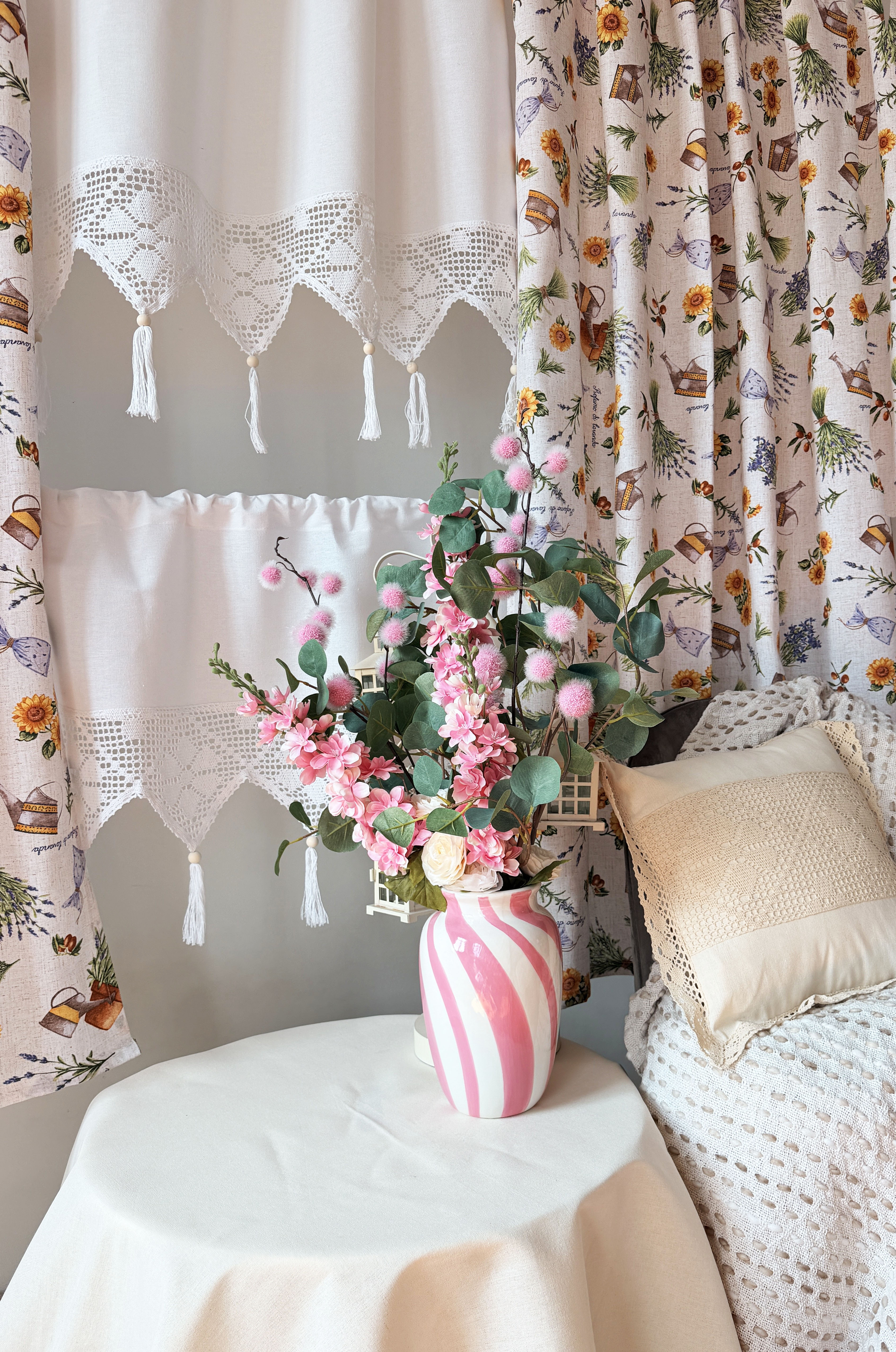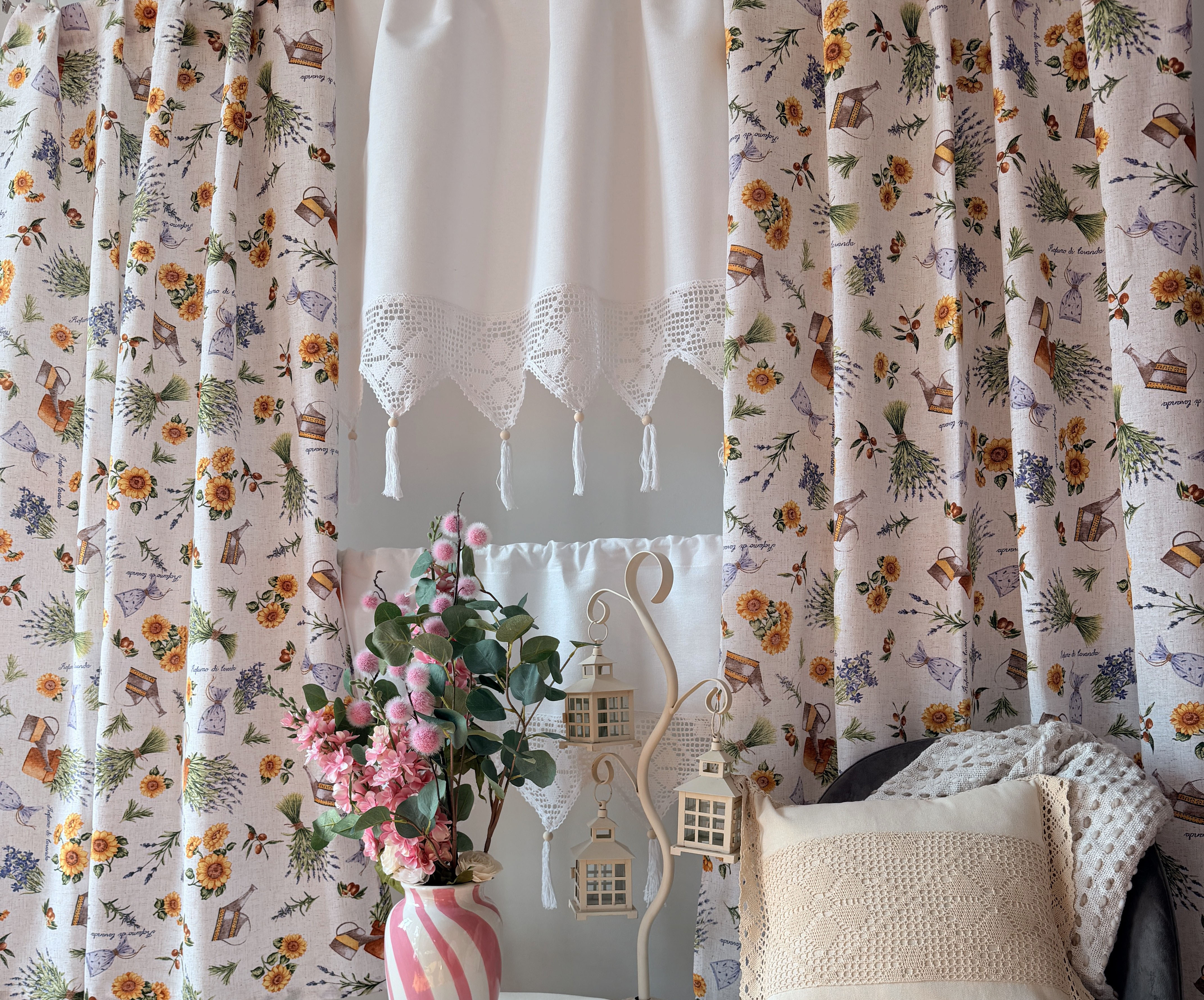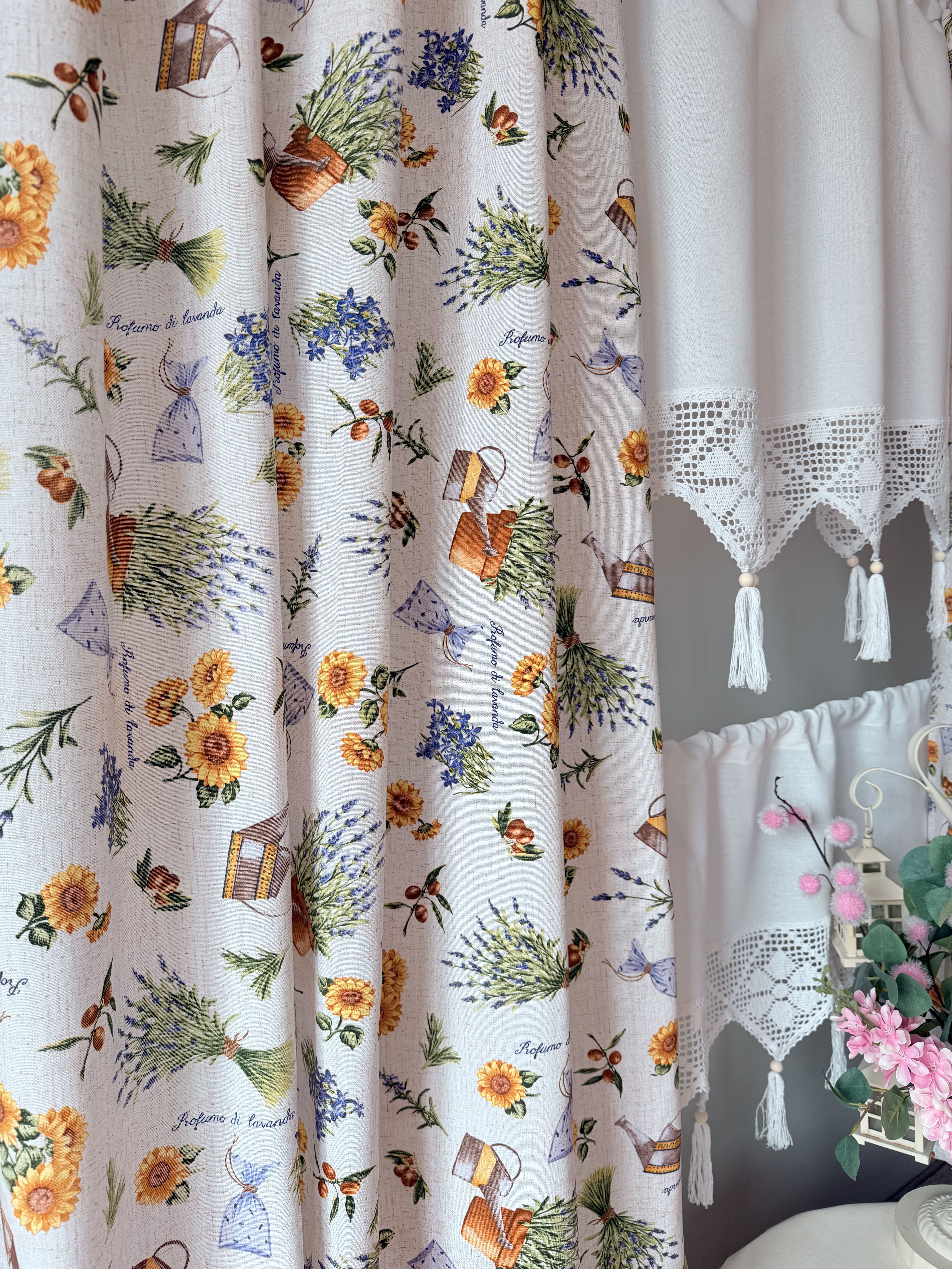 W cenie dwie sztuki zasłonek plus zazdrostka. Jest możliwość zakupienia do kompletu obrusów, poszewek.