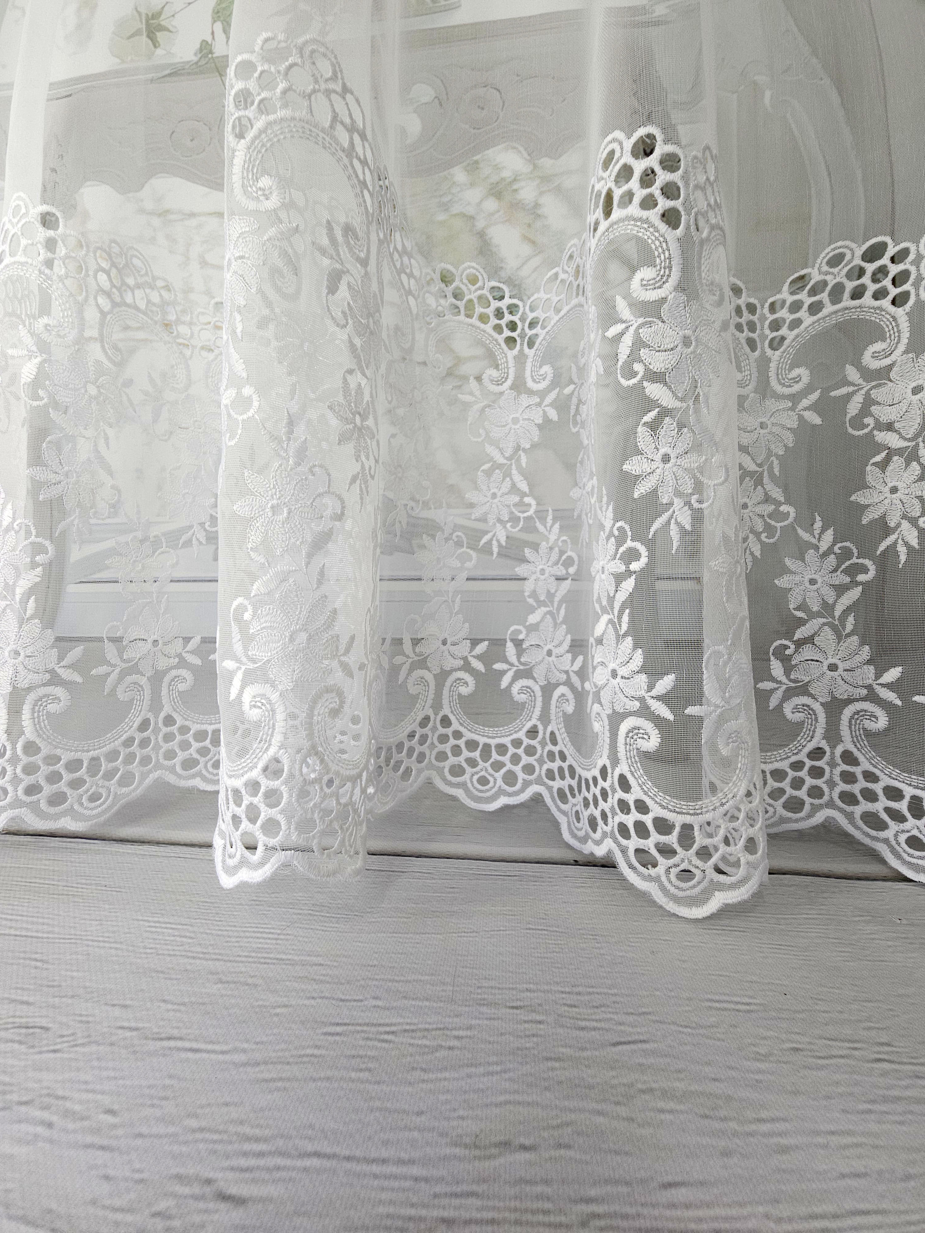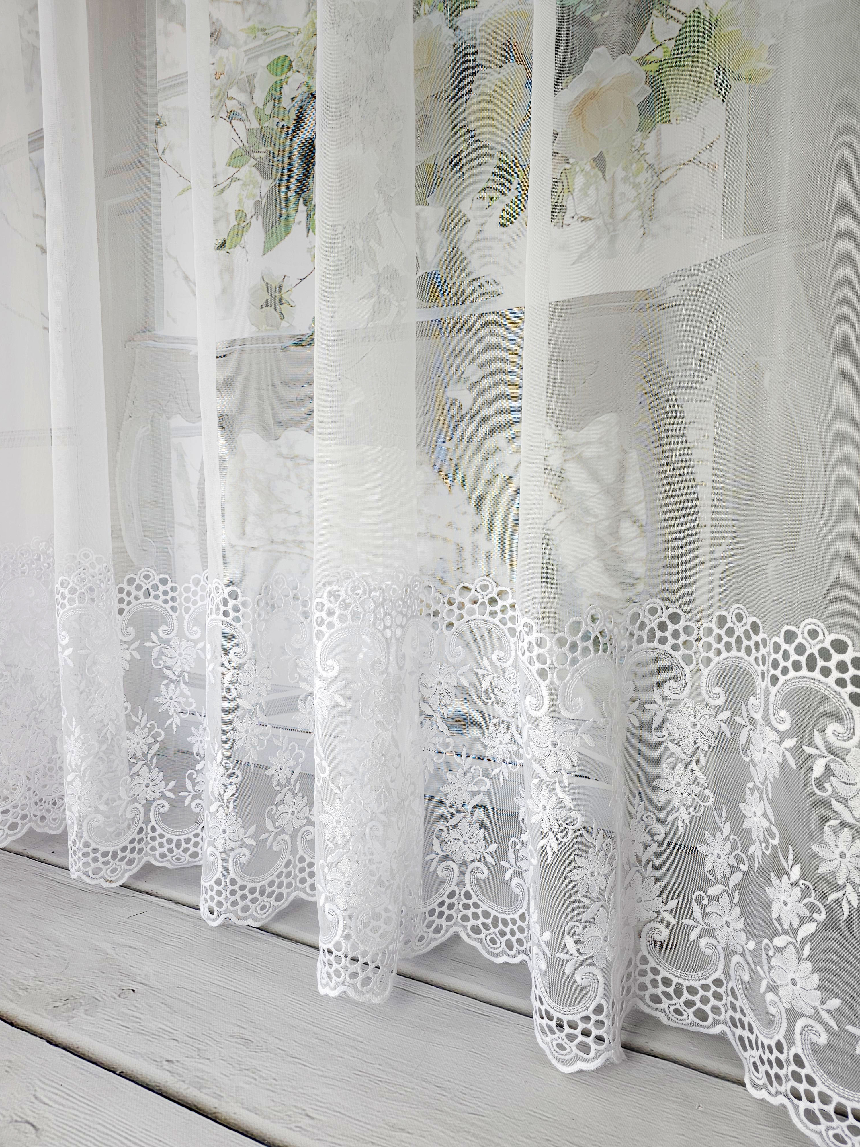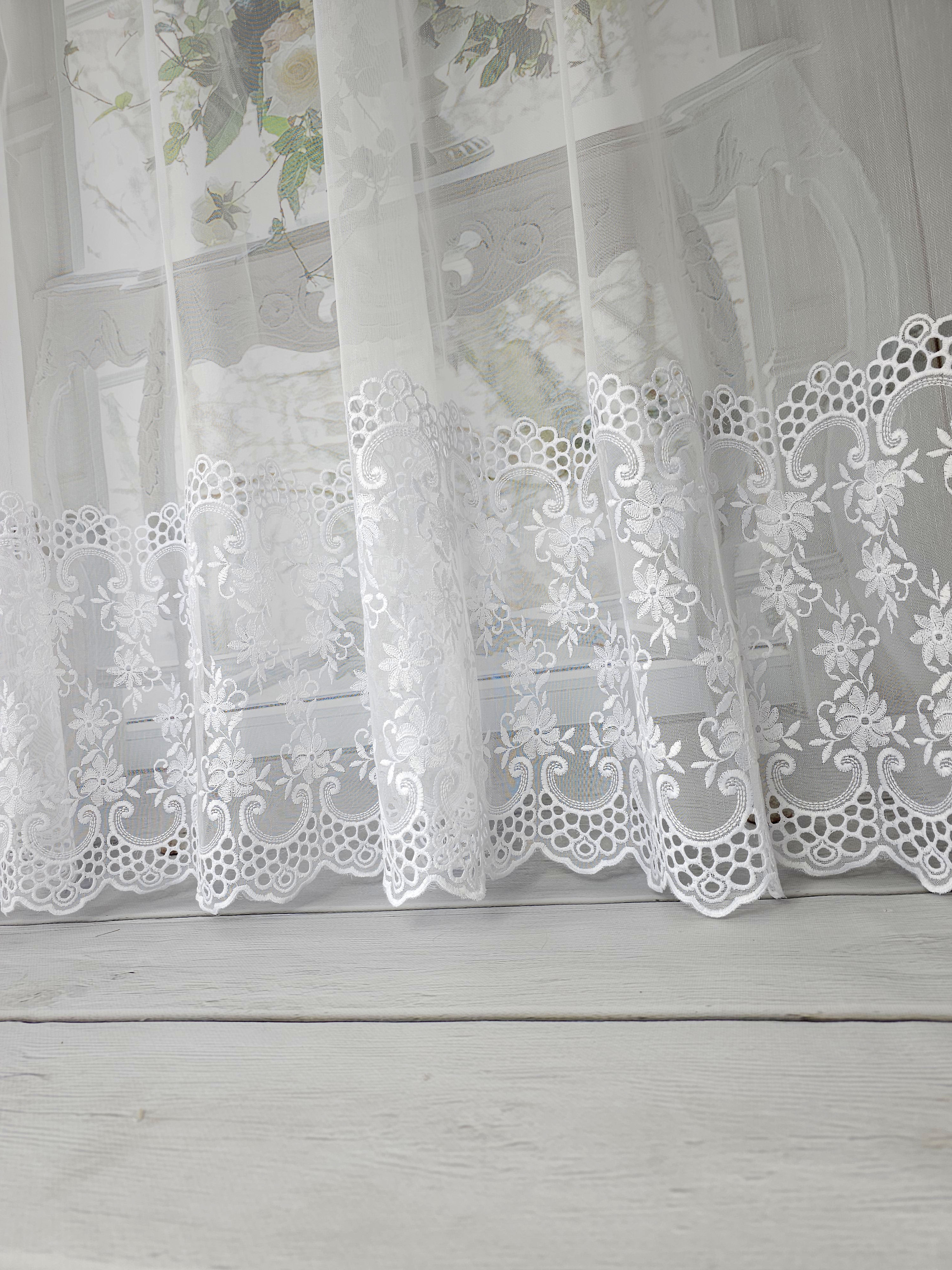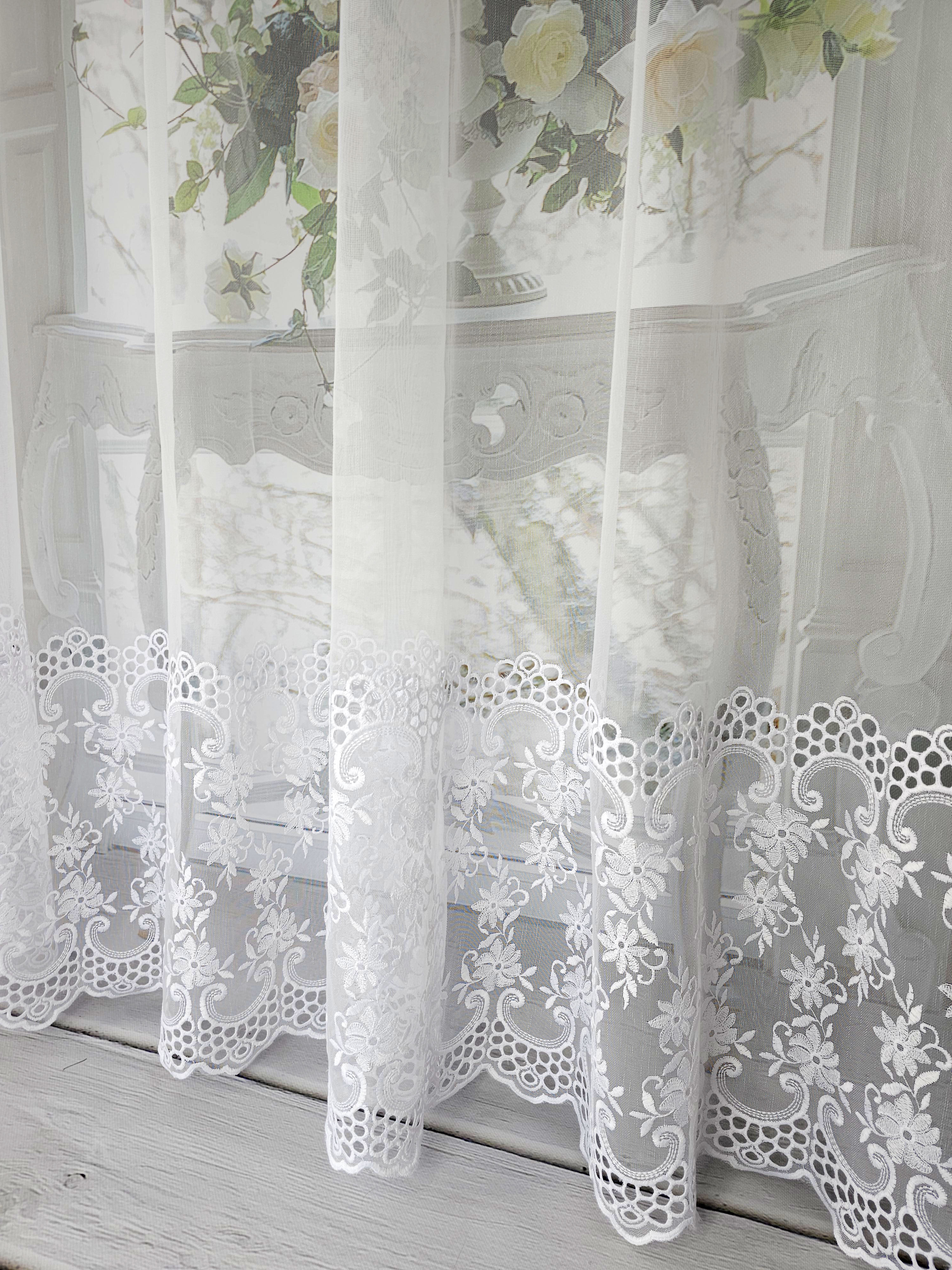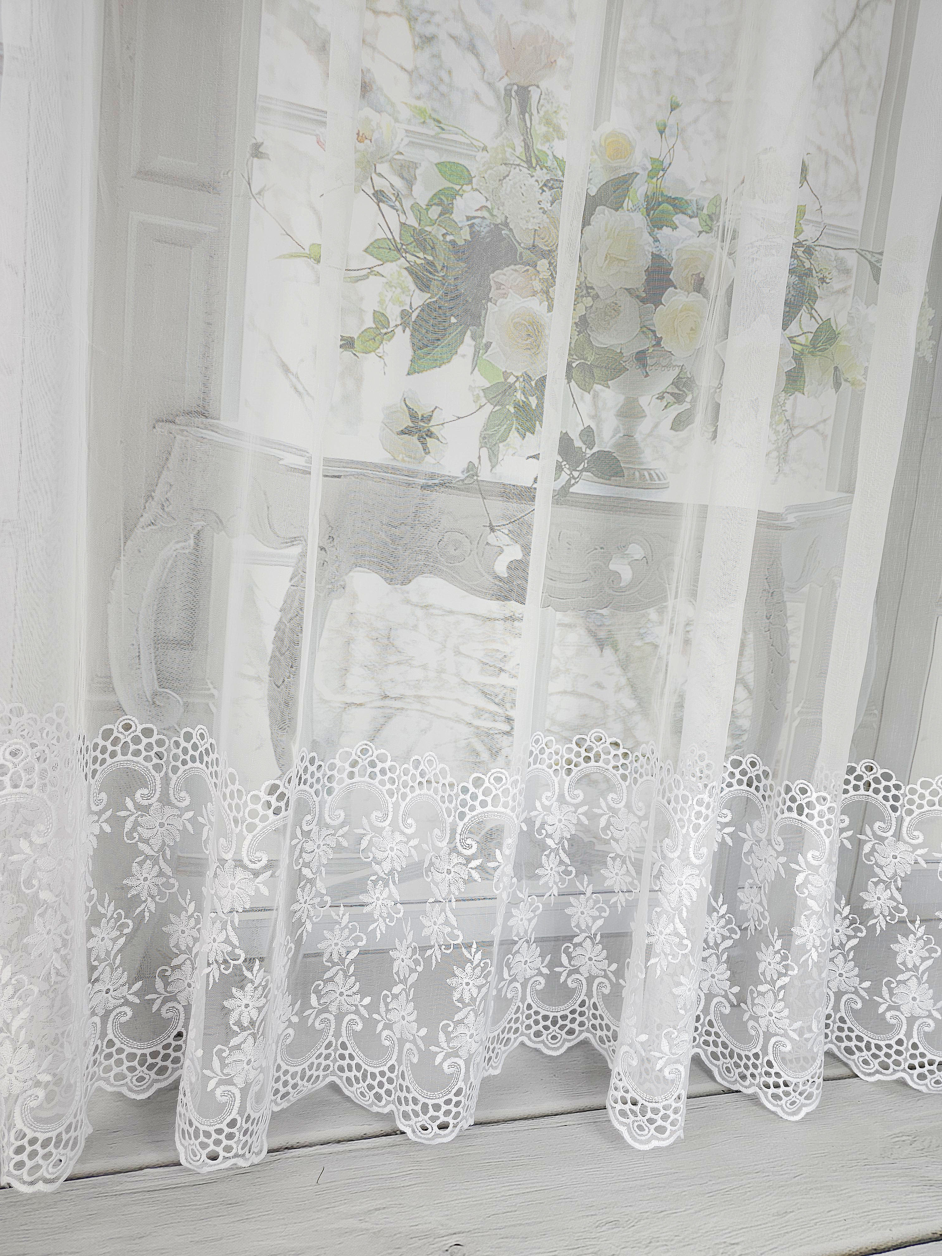 Firana przezroczysta z haftem na dole .